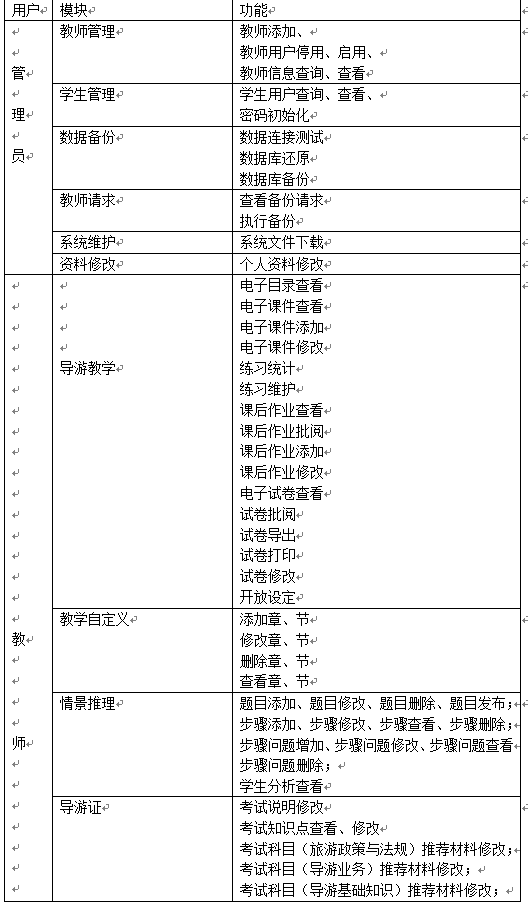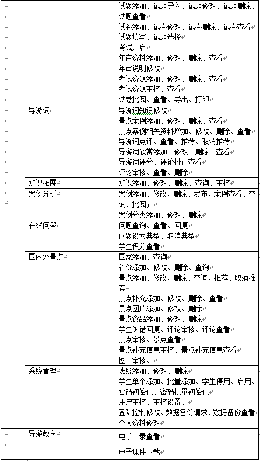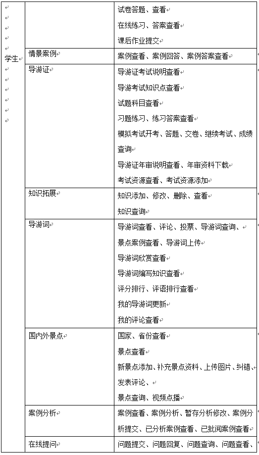 學(xue)(xue)(xue)生的主要功能是導游教學(xue)(xue)(xue)知(zhi)識的學(xue)(xue)(xue)習、完成情景推理中包含的案例及題(ti)目(mu)、導游證(zheng)考試學(xue)(xue)(xue)習及模擬考試、導游拓(tuo)展知(zhi)識學(xue)(xue)(xue)習,同時可添加新的知(zhi)識供其他同學(xue)(xue)(xue)學(xue)(xue)(xue)習、導游詞學(xue)(xue)(xue)習并(bing)編寫導游詞、國內外景點學(xue)(xue)(xue)習、案例分(fen)析和在線提問(wen)。
