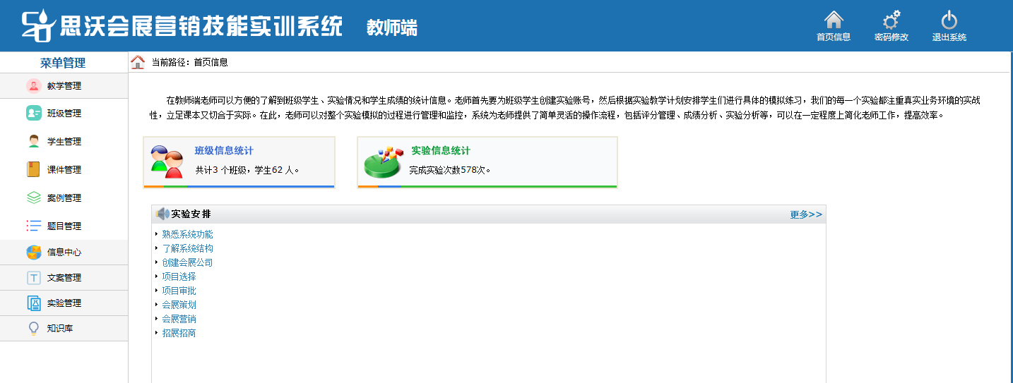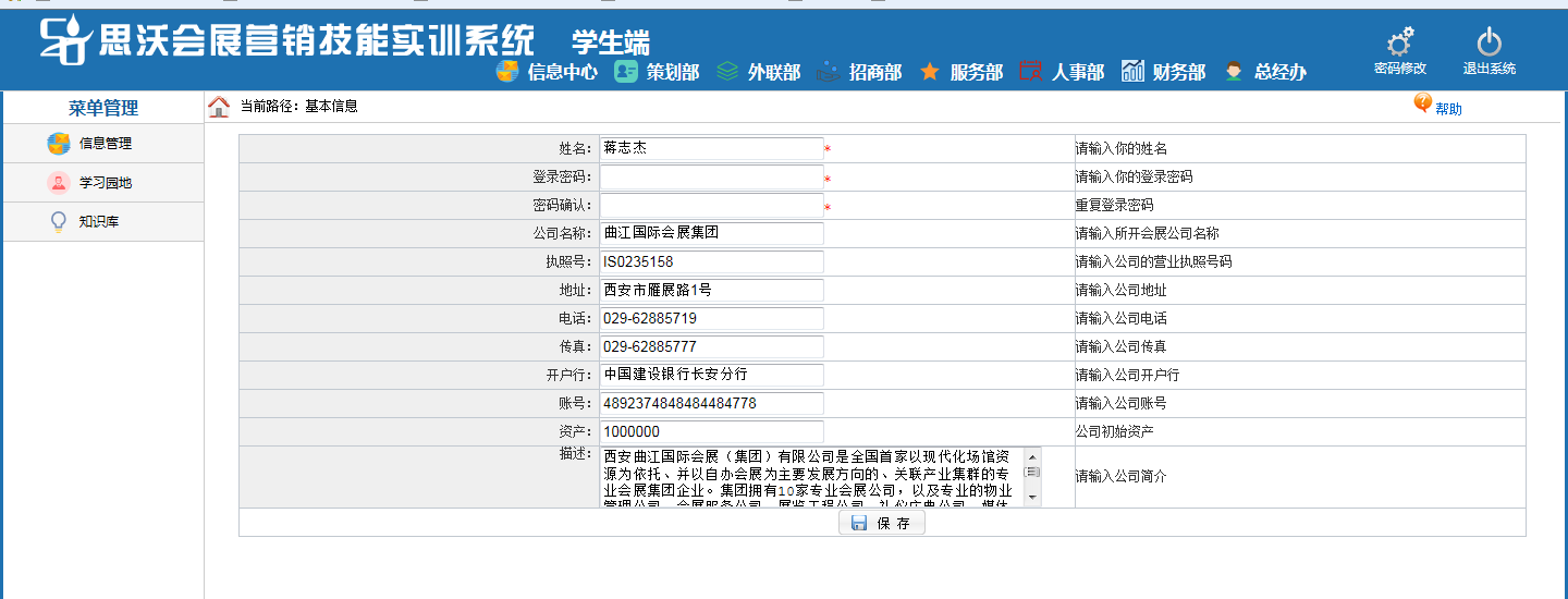 思沃(wo)會(hui)展(zhan)(zhan)(zhan)(zhan)營銷模(mo)擬(ni)實(shi)(shi)訓系統以模(mo)擬(ni)會(hui)展(zhan)(zhan)(zhan)(zhan)公(gong)司的(de)策(ce)劃(hua)部(bu)(bu)、外聯(lian)部(bu)(bu)、招(zhao)商部(bu)(bu)、會(hui)展(zhan)(zhan)(zhan)(zhan)服務(wu)部(bu)(bu)、人(ren)事(shi)部(bu)(bu)、財務(wu)部(bu)(bu)以及總經(jing)辦7大(da)業(ye)務(wu)部(bu)(bu)門為基礎(chu)而展(zhan)(zhan)(zhan)(zhan)開實(shi)(shi)驗(yan)操(cao)作(zuo)的(de)。該(gai)教(jiao)學(xue)(xue)平(ping)臺軟件業(ye)務(wu)內(nei)容(rong)包括了(le):項目上報審批、項目的(de)策(ce)劃(hua)安排、服務(wu)商管理(li)、人(ren)事(shi)招(zhao)聘與管理(li)、會(hui)展(zhan)(zhan)(zhan)(zhan)的(de)現(xian)場(chang)服務(wu)與合同管理(li)等等,讓學(xue)(xue)生通過實(shi)(shi)驗(yan)感(gan)受會(hui)展(zhan)(zhan)(zhan)(zhan)項目的(de)系統化管理(li)流程(cheng)與業(ye)務(wu)操(cao)作(zuo)內(nei)容(rong),不但(dan)能夠(gou)了(le)解會(hui)展(zhan)(zhan)(zhan)(zhan)項目從立項審批到策(ce)劃(hua)、宣傳(chuan)、招(zhao)展(zhan)(zhan)(zhan)(zhan)招(zhao)商、現(xian)場(chang)服務(wu)以及會(hui)后總結各個(ge)(ge)環節的(de)業(ye)務(wu),同時還可以掌(zhang)握各種文案的(de)寫作(zuo)技巧,從而讓學(xue)(xue)生真正(zheng)的(de)理(li)解并掌(zhang)握會(hui)展(zhan)(zhan)(zhan)(zhan)這一行業(ye)的(de)各種知(zhi)識與業(ye)務(wu)要求(qiu)。為學(xue)(xue)生以后的(de)工(gong)作(zuo)、學(xue)(xue)習提(ti)供了(le)一個(ge)(ge)實(shi)(shi)戰演練的(de)實(shi)(shi)訓平(ping)臺,增強了(le)學(xue)(xue)生進入工(gong)作(zuo)崗位后的(de)實(shi)(shi)力。