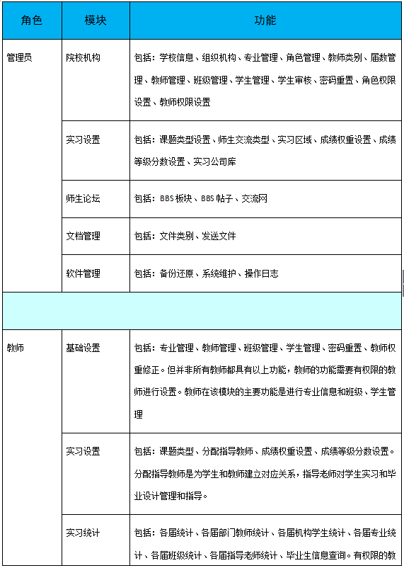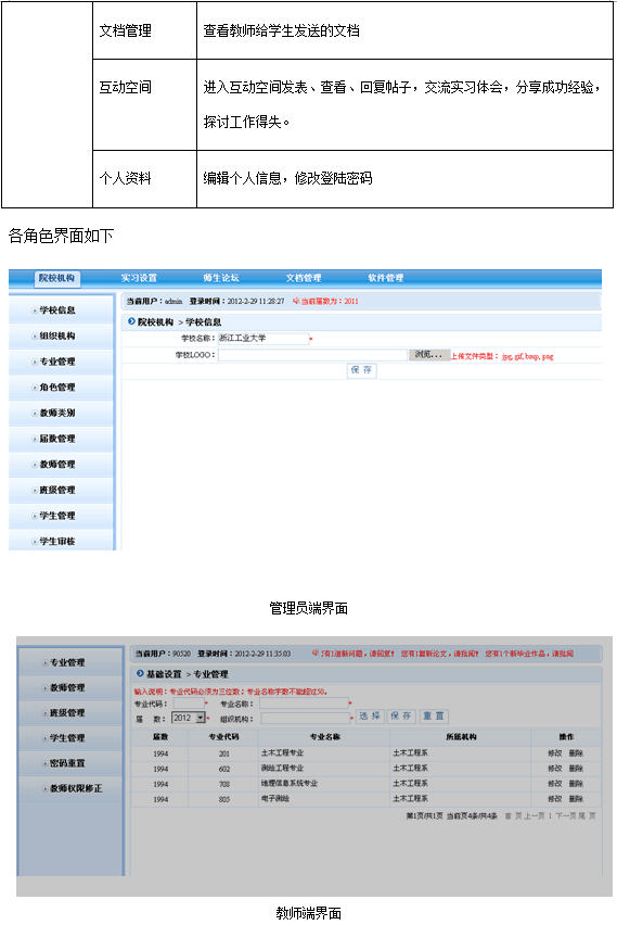 軟(ruan)件按管(guan)理員(yuan)、教(jiao)(jiao)師(shi)、學(xue)(xue)生分為(wei)三(san)種用戶(hu)權限(xian)(xian)。其中,管(guan)理員(yuan)設(she)(she)置(zhi)軟(ruan)件基礎信息,包(bao)括:學(xue)(xue)校(xiao)信息、院校(xiao)組織機(ji)構、屆數(shu)年份(fen)管(guan)理、教(jiao)(jiao)師(shi)類別(bie)、權限(xian)(xian)管(guan)理等。教(jiao)(jiao)師(shi)根(gen)據權限(xian)(xian)不同,功能(neng)模塊不同,只有開通了權限(xian)(xian)的(de)教(jiao)(jiao)師(shi)可操作相應的(de)功能(neng)。教(jiao)(jiao)師(shi)角色的(de)主要模塊包(bao)括:系(xi)統(tong)設(she)(she)置(zhi)、統(tong)計查(cha)看(kan)、畢(bi)(bi)業(ye)實(shi)習(xi)、畢(bi)(bi)業(ye)設(she)(she)計、成績管(guan)理、輔(fu)助工具(ju)。學(xue)(xue)生在(zai)(zai)實(shi)習(xi)期間,應按時填(tian)寫周記,完成教(jiao)(jiao)師(shi)的(de)作業(ye),在(zai)(zai)有疑問(wen)時還可以向教(jiao)(jiao)師(shi)提問(wen)。學(xue)(xue)生端的(de)主要模塊有:畢(bi)(bi)業(ye)實(shi)習(xi)匯總、畢(bi)(bi)業(ye)實(shi)習(xi)、畢(bi)(bi)業(ye)設(she)(she)計、成績查(cha)看(kan)、輔(fu)助工具(ju)