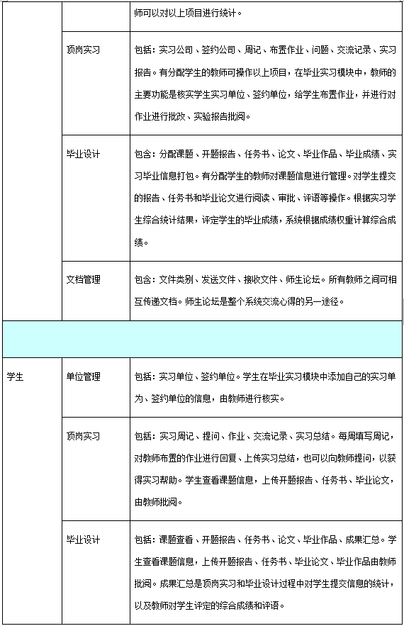 便于(yu)教師的(de)優(you)質資(zi)源共享,加深教師之(zhi)間合(he)作。學(xue)生(sheng)的(de)問題及(ji)時(shi)得以解決,分享經驗,探討得失。學(xue)生(sheng)可以提交實習單(dan)位的(de)工作介(jie)紹以及(ji)簽約單(dan)位,供教師查閱。