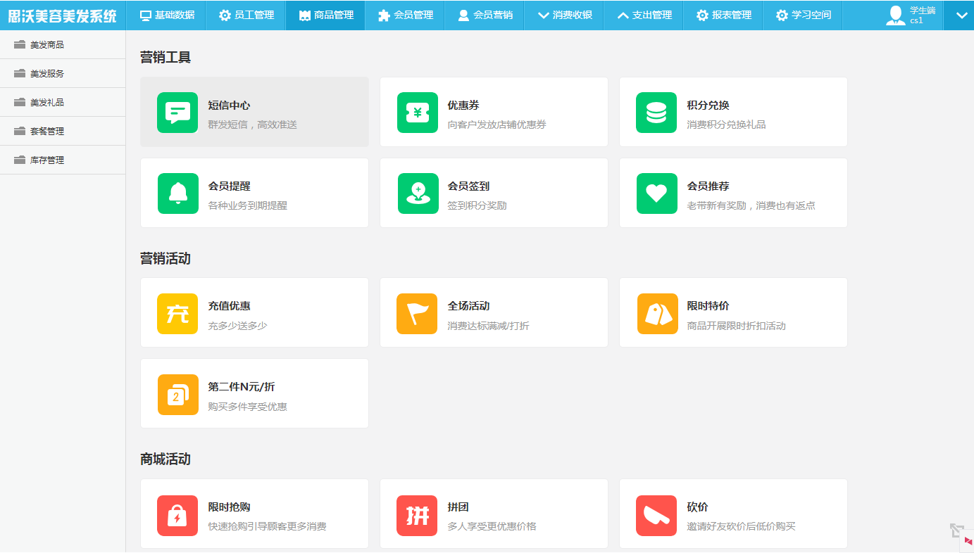 思沃(wo)美(mei)容美(mei)發(fa)(fa)模(mo)擬(ni)實(shi)訓(xun)系(xi)統是一款專(zhuan)業針對美(mei)容美(mei)發(fa)(fa)行業開發(fa)(fa)的會(hui)員(yuan)收銀管理(li)(li)系(xi)統,門(men)店業務(wu)環(huan)節全面(mian)覆蓋,會(hui)員(yuan)管理(li)(li)&營銷(xiao)一步到位,適(shi)合學(xue)生(sheng)真實(shi)模(mo)擬(ni)美(mei)容美(mei)發(fa)(fa)店進行會(hui)員(yuan)管理(li)(li)、會(hui)員(yuan)營銷(xiao)、店鋪收銀、打折積分、儲值消費、禮品(pin)兌換、商品(pin)管理(li)(li)、商品(pin)進銷(xiao)存、員(yuan)工提成、財(cai)務(wu)報表(biao)等基本操作。